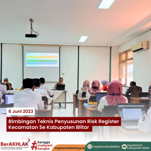 Bimbingan Teknis Penyusunan Risk Register Kecamatan Se Kabupaten Blitar dalam rangka Perencanaan Pengawasan Berbasis Resiko (PPBR) dilaksanakan selama 2 (Dua) hari, yaitu mulai tanggal 6-7 Juni 2023 bertempat di Badan Pengawasan Keuangan dan Pembangunan (BPKP) Perwakilan Jawa Timur, Sidoarjo.
